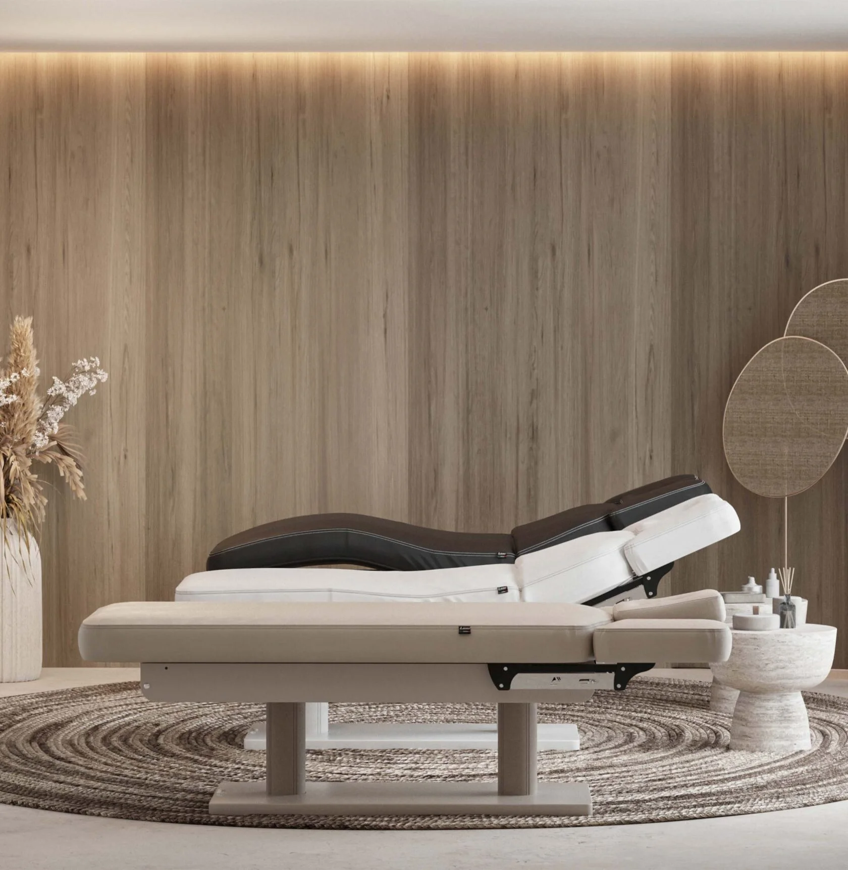 • Ключевая особенность — ультракомфортный матрас с эффектом памяти, оснащенный регулируемыми подлокотниками и подголовником с отверстием для лица. Эргономичная конструкция способствует полному расслаблению мышц спины и шеи, повышая эффективность массажных процедур.